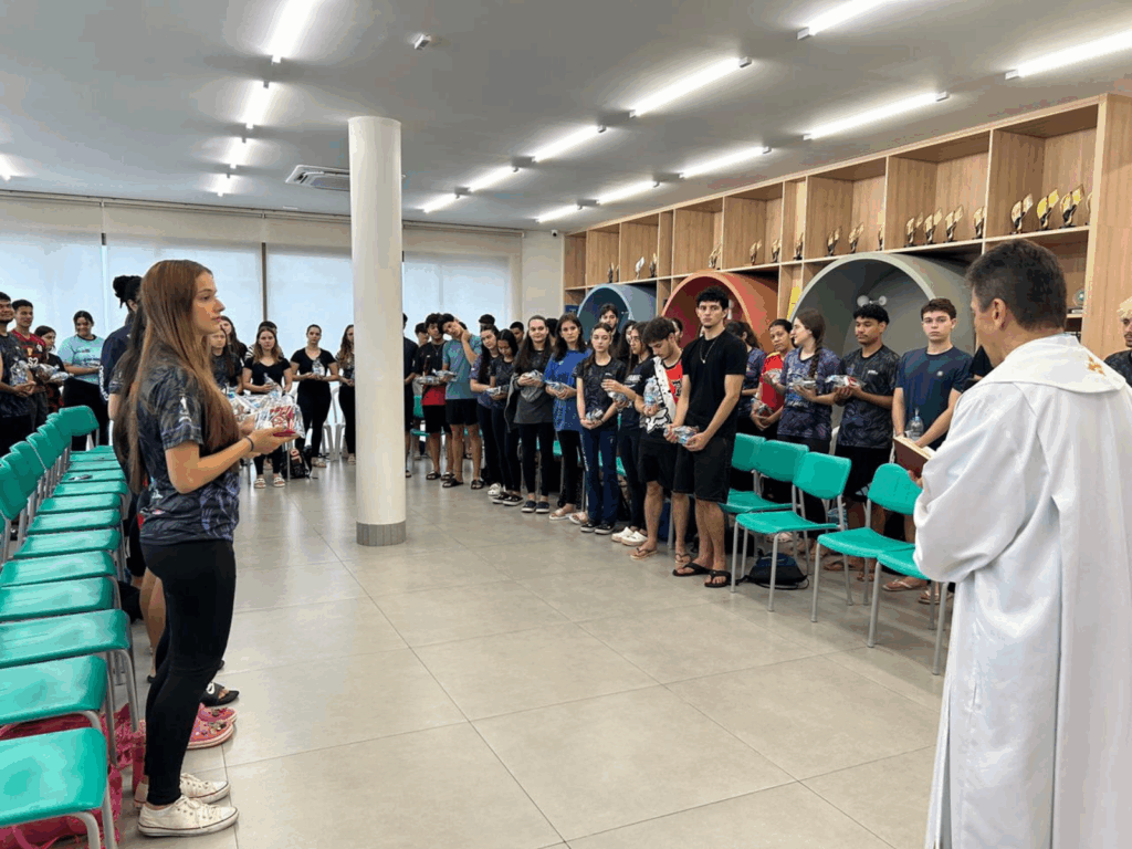 Em seguida, o Padre Marcelo conduziu um momento de oração e reflexão com os vestibulandos, pedindo bênçãos e serenidade para todos que enfrentarão o exame. O clima foi de reflexão, união e esperança, marcando mais uma etapa significativa na jornada dos alunos rumo ao futuro.