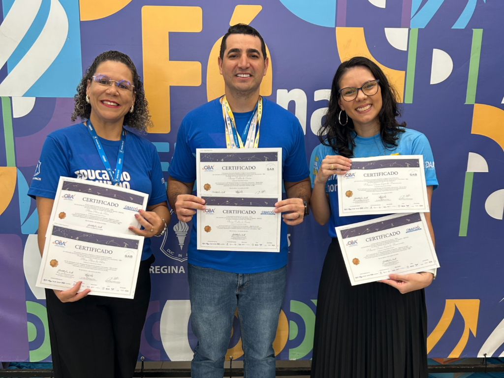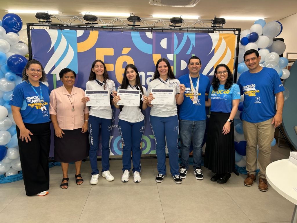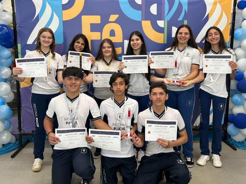 O Colégio Regina Pacis promoveu, nesta semana, uma cerimônia para homenagear os estudantes que se destacaram na Olimpíada Brasileira de Foguetes. O momento contou com a participação da comunidade escolar e celebrou o desempenho dos participantes, que representaram a instituição em uma das mais reconhecidas competições científicas do país.