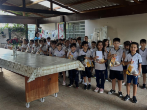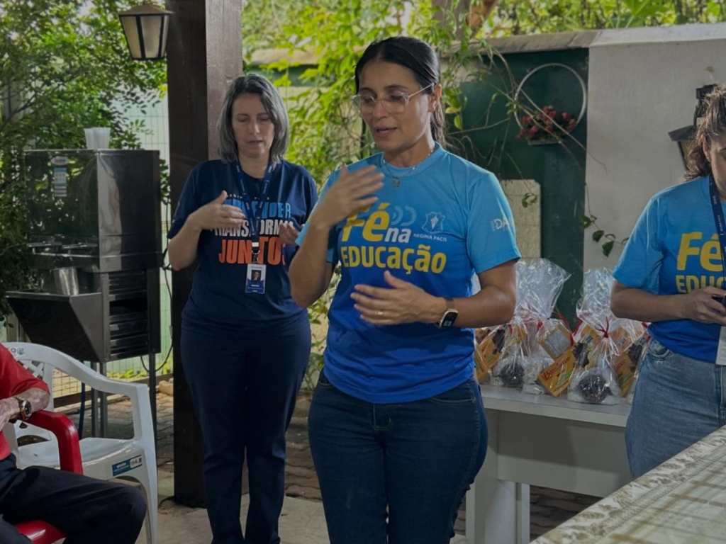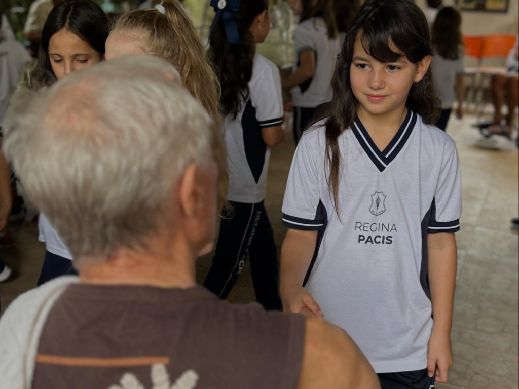 Os alunos do Colégio Regina Pacis realizaram uma visita ao Lar do Idoso Madre Vannini com uma surpresa especial ao levar kits natalinos e litros de leite, entregues pessoalmente. As crianças também emocionaram os residentes com belas músicas da Cantata de Natal.